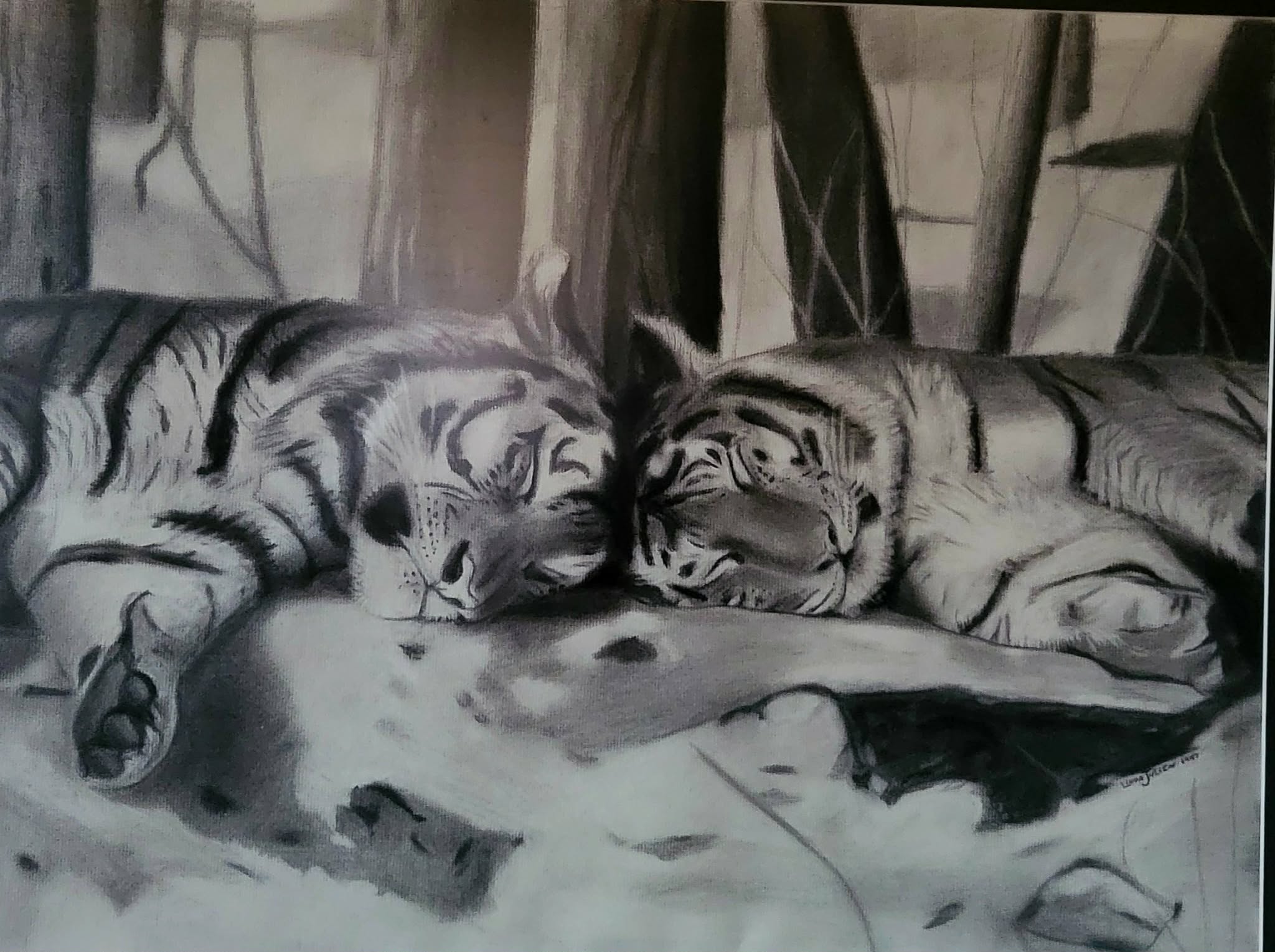 Fusain sur papier coton, vitre anti-reflet avec encadrement. Oeuvre autographiée par Siegfried & Roy 24" x 18"